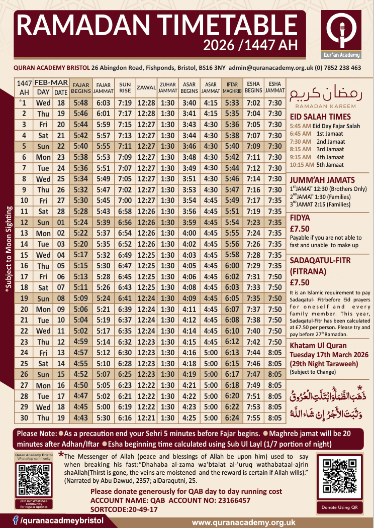 Ramadhan calendar for 2026